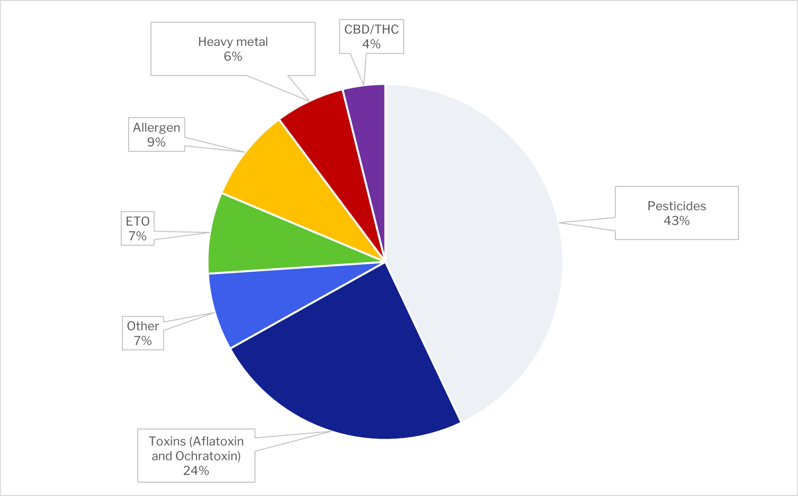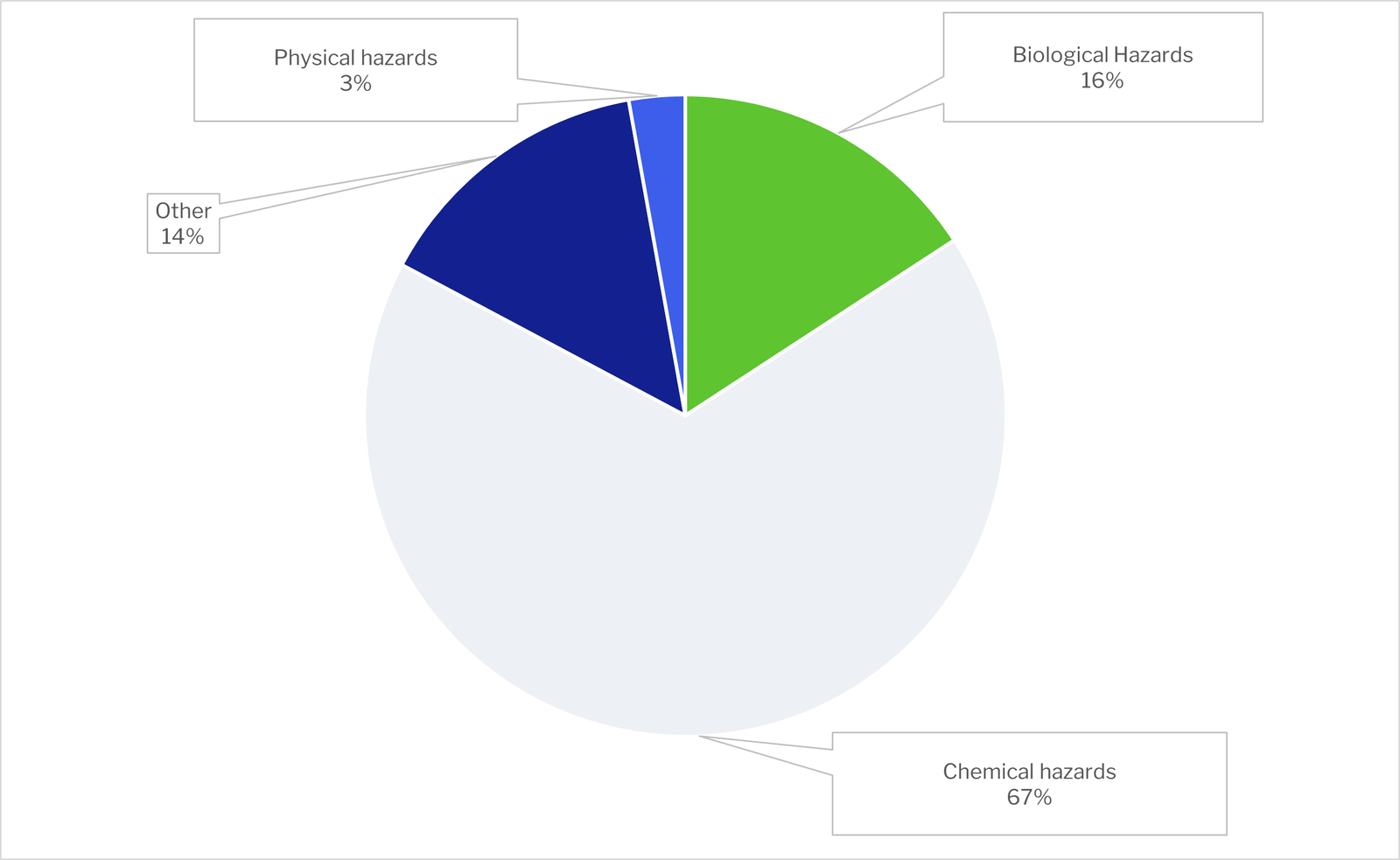 For the chemical hazards, the details are provided below. The main hazard is related to the presence of pesticides mainly from fruits and vegetables (80%), following by Aflatoxin mainly from nuts, nut products and seeds (57%). A small portion of the notification is related to the unauthorized CBD ingredient or a too high level of THC.