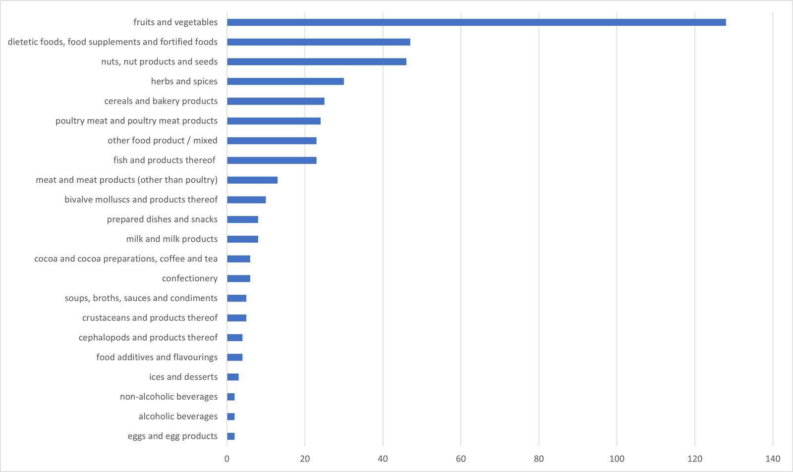 In March 2022, 424 notifications have been reported and related to food products. Similarly to the previous month, the top 3 categories that count for almost half of the notifications are: fruits and vegetables, dietetic foods, food supplements and fortified foods and nuts, nut products and seeds.