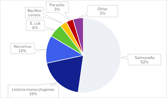 For the biological hazards, the details are provided below. The main hazards are related to a contamination of Salmonella mainly coming from poultry meat and poultry meat products (60%).